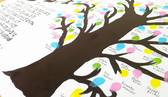 結婚式に来たゲストが一人一人、指印をするとそれが葉っぱとなってどんどん木が茂っていって最後大きな木が出来上がる、ゲスト参加型の演出です。指印の近くには、二人の結婚を承認した証として署名を行います。